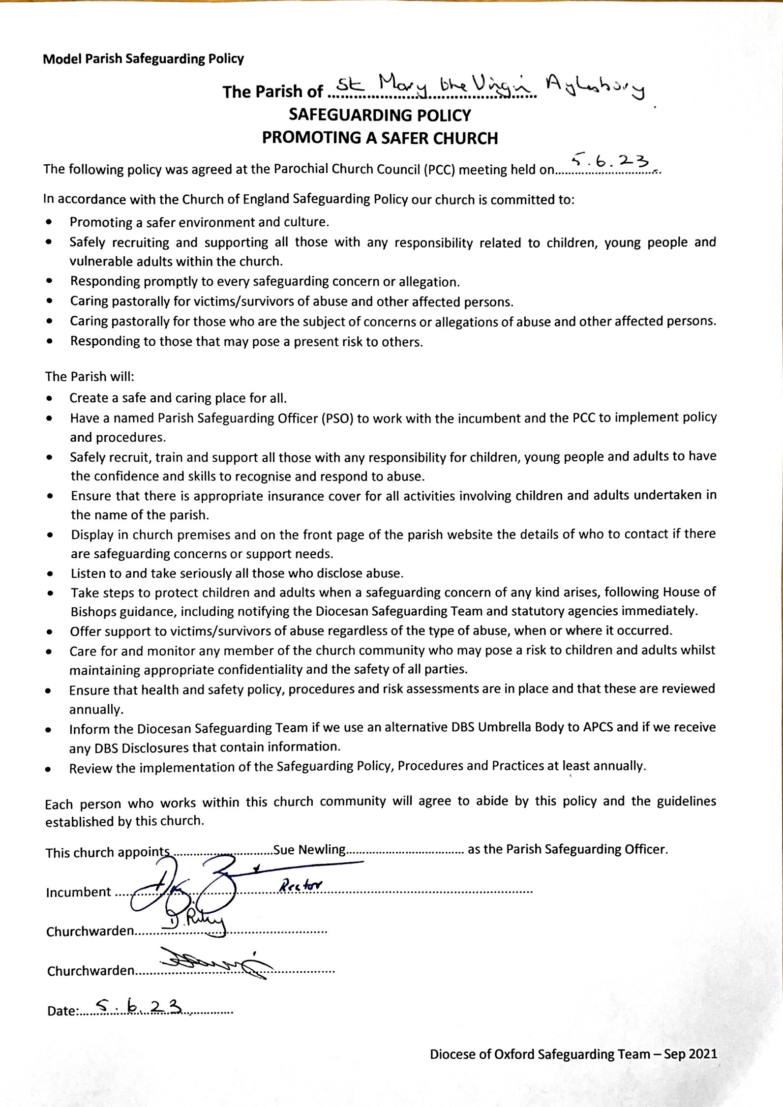 It is important to us that everyone who takes part in Church activities is able to feel safe and secure. As a result, we have agreed to adopt and follow the Diocese of Oxford’s Safeguarding Policy.